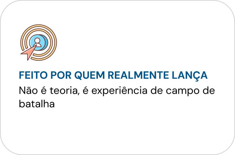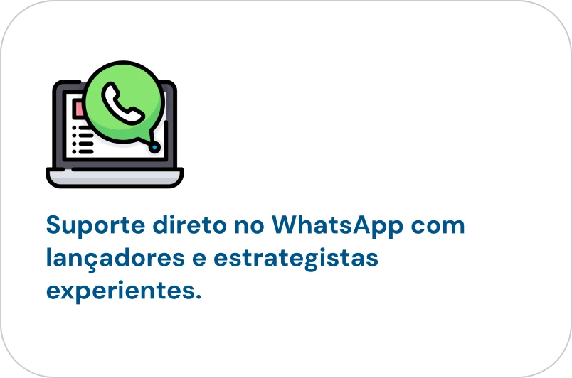 Suporte de verdade. WhatsApp direto, plantões semanais, grupo exclusivo. Não é chatbot, não é FAQ automático. É gente real que entende de lançamento